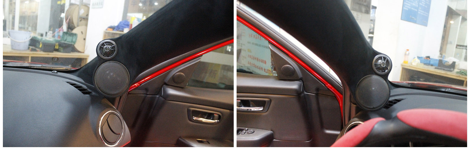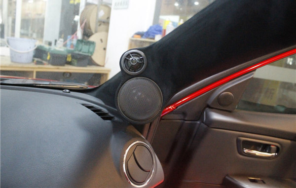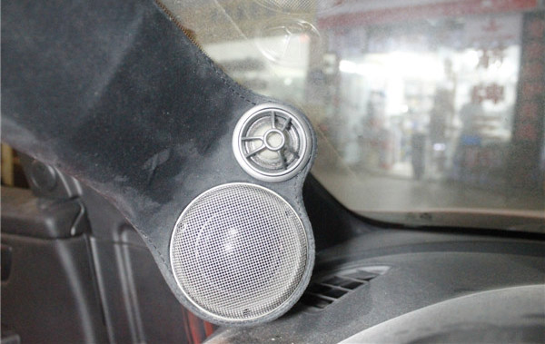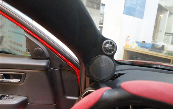 A柱高音倒膜并包上绒布,将中音喇叭与高音喇叭装到A柱位置上形成8字,使声场更加宽广。A柱打包的外层皮,与原车颜色一样,丝毫不影响车内装饰的美观。