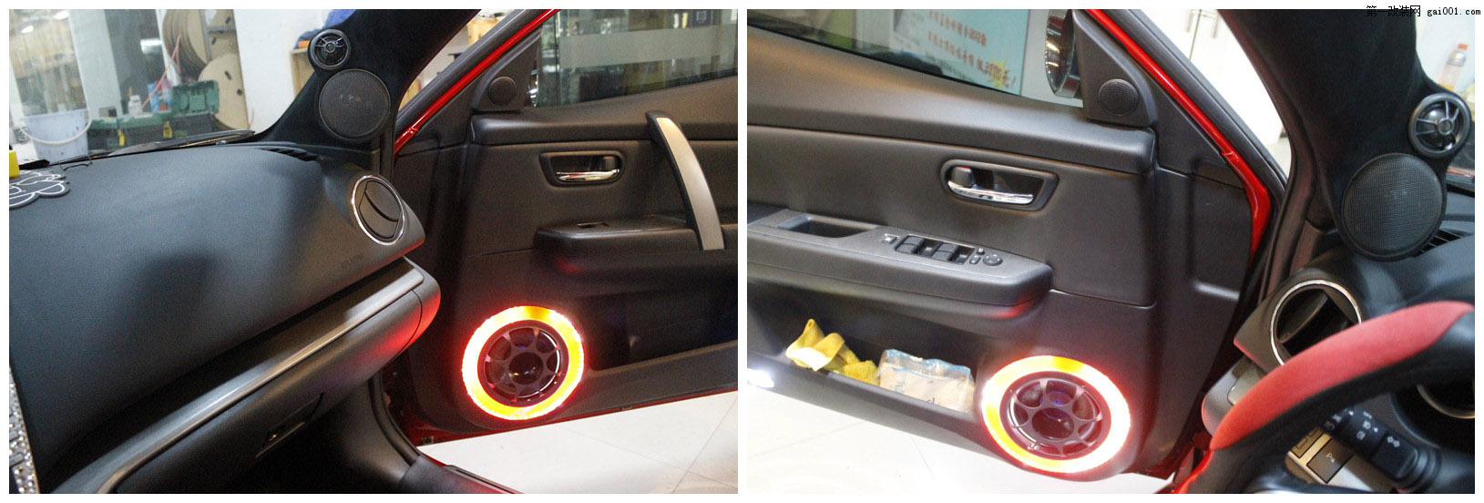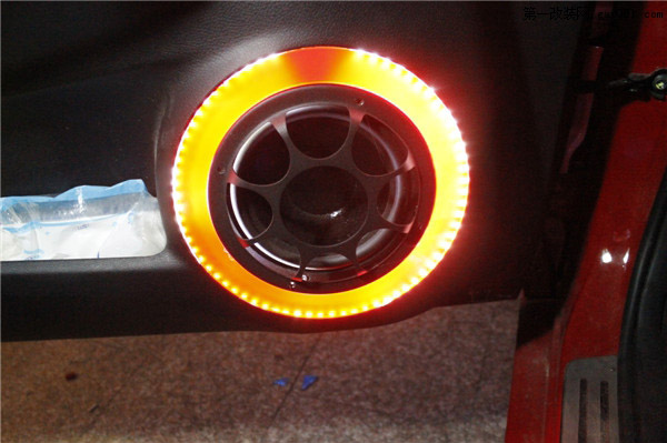 前声场的安装---雷贝琴三分频的中低音单元(再安装炫彩夺目的灯光,让整个效果更加耀眼抢镜。PS:灯光只有在车门开的时候才会亮。